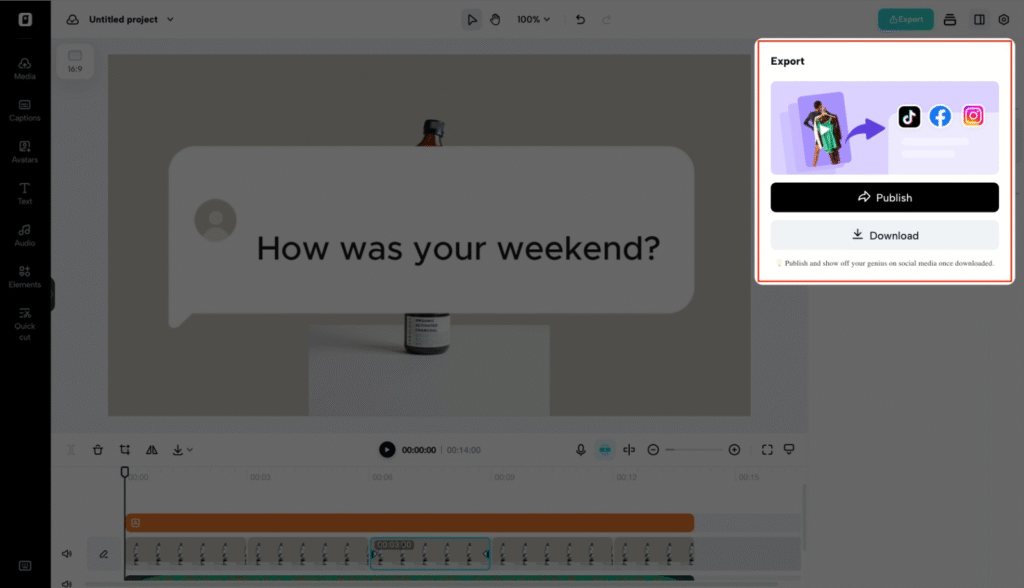 Preview your video to ensure everything looks perfect. Check captions, timing, colors, and overall framing. If needed, make minor adjustments. Once satisfied, hit “Export.” You can save the video in your preferred format or publish it directly on social media. In minutes, your ad is ready to capture attention.